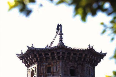 為了保持古建筑物的藝術(shù)特點(diǎn)接閃器采用避雷帶和避雷短針相結(jié)合并宜在敷有引下線的屋角避雷帶上焊接長30-。